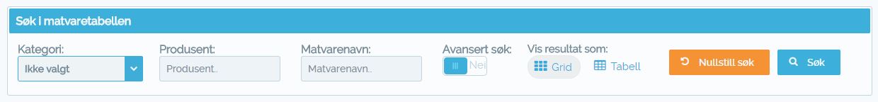 NB: Søket vil alltid søke etter matvarer som inneholder matvarenavnet som er definert. Matvaren trenger derfor ikke å begynne med søketermen som er oppgitt. - Avansert søk: