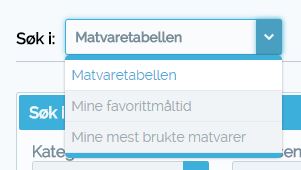 Oppe i venstre hjørne av måltidsregistreringen vil du finne følgende nedtrekksboks. Gjør et valg i denne for å endre søkeverktøy: