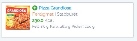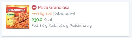 Alle matvarer har minimum "Gram - 1.0" porsjonsstørrelsen definert som valg i nedtrekkslisten. Porsjonsstørrelsene er der for å gjøre det lettere for deg å velge korrekt vekt på matvaren. Som vist i eksempelet over har "Grandiosa" definert en porsjonsstørrelse navngitt "En stykk - 575.0g". Ved valg av denne porsjonsstørrelsen endres "Gram" kolonne verdien automatisk. - Antall